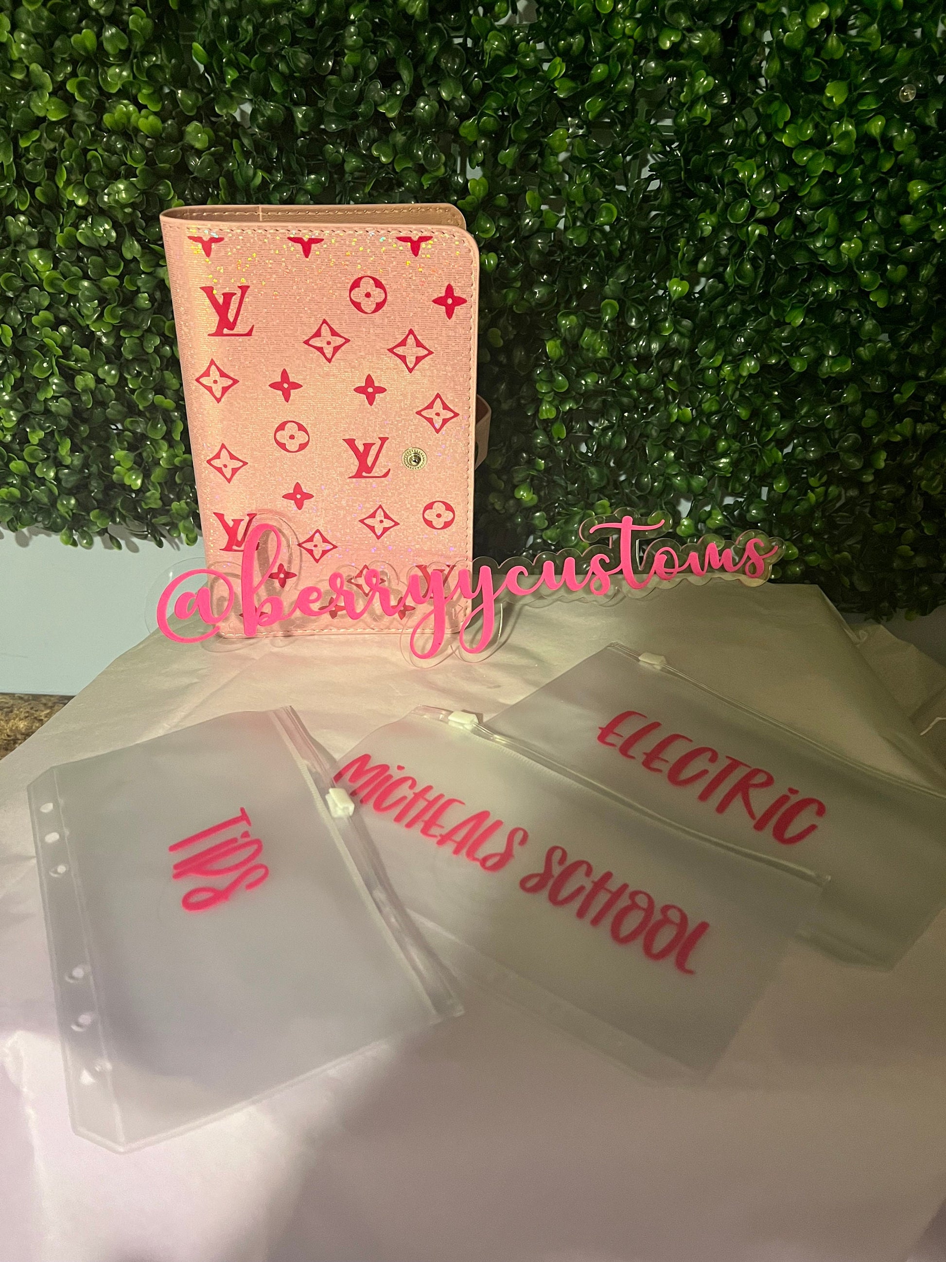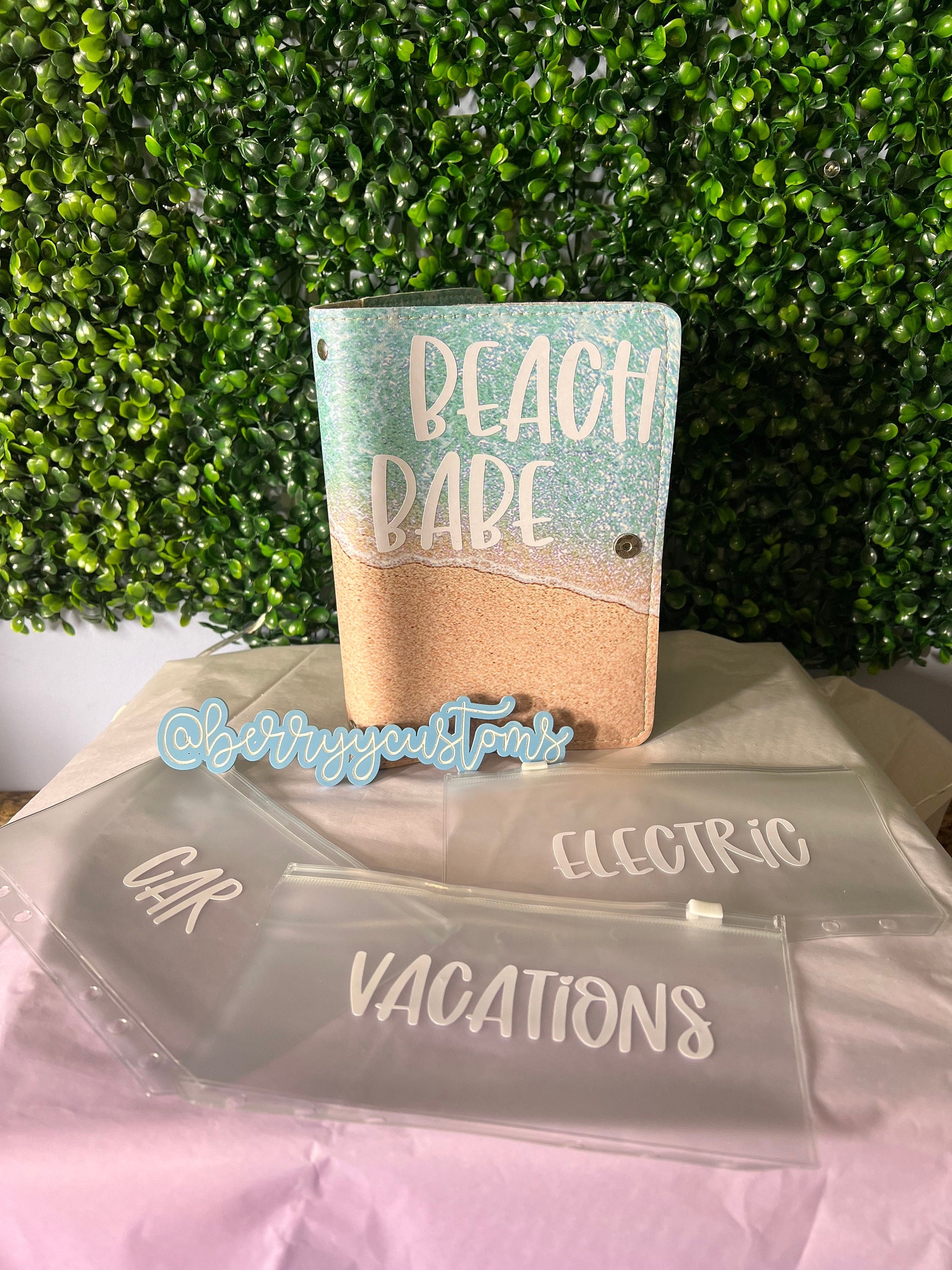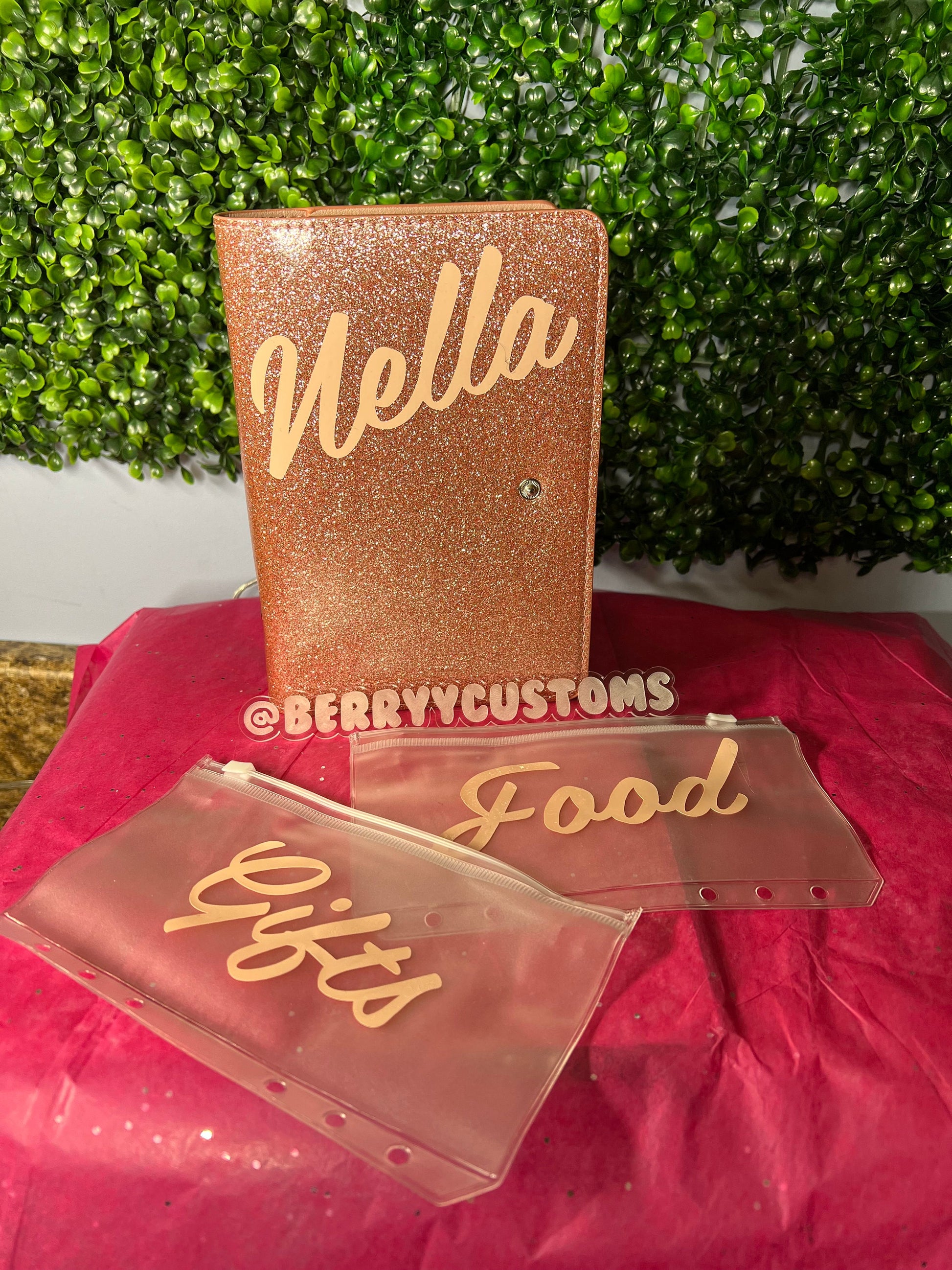 budget binders with 8 clear pouches to label whatever you want it to say ( see pictures for examples)