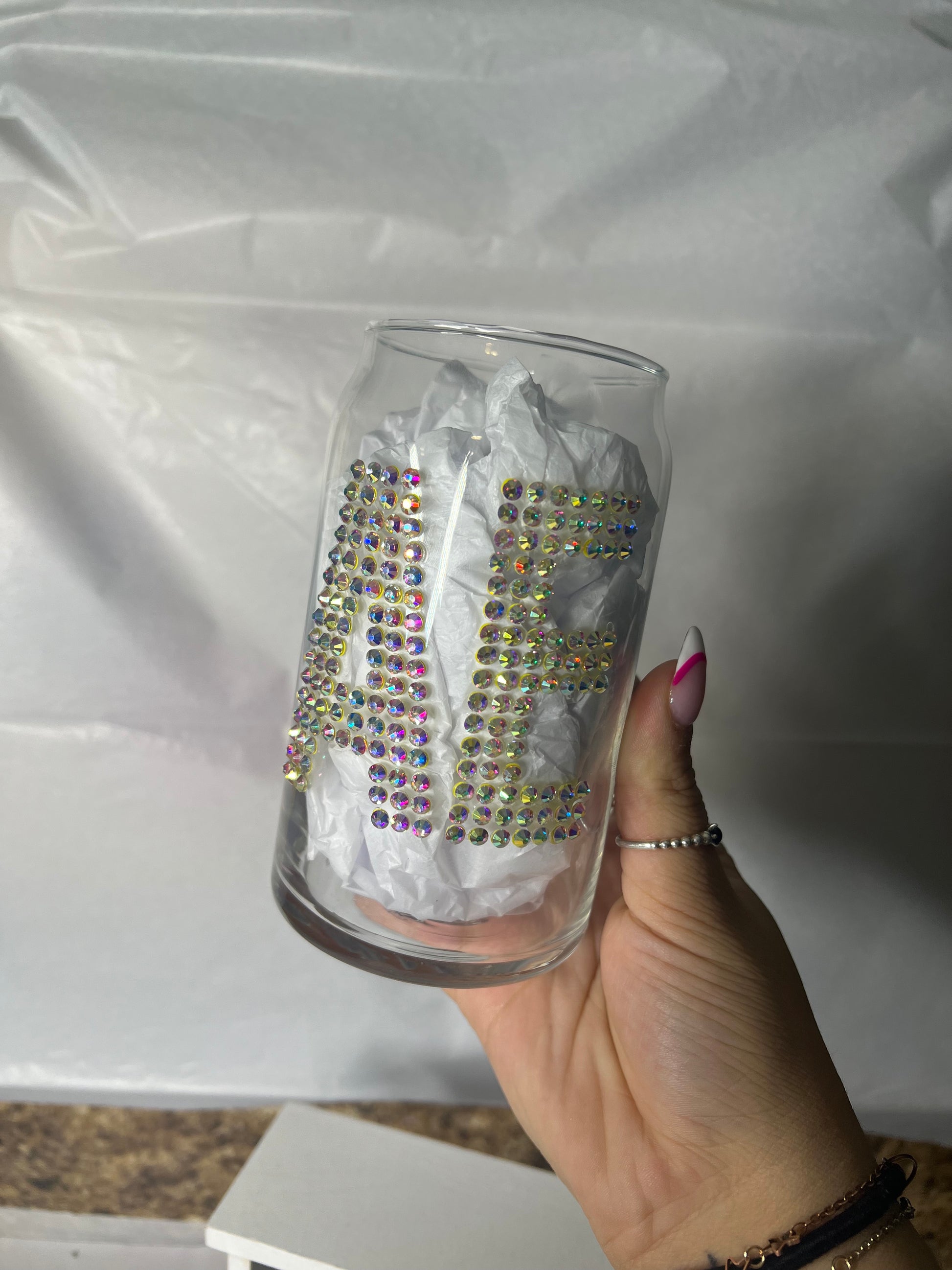 initial rhinestone beer can glass